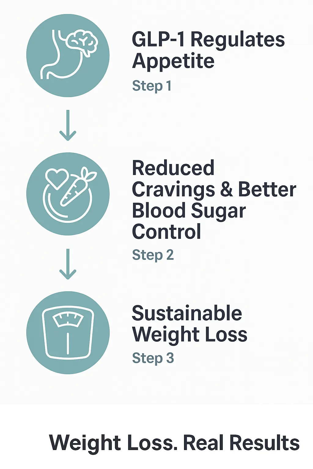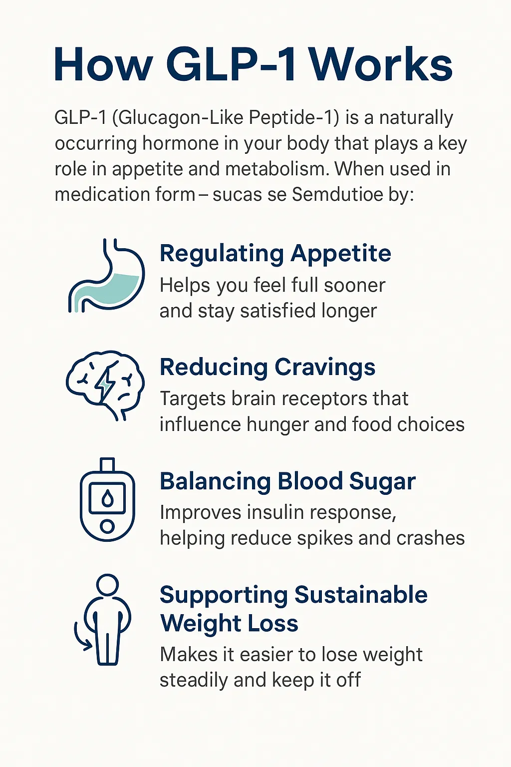 GLP-1 treatments are designed to work with your body by helping regulate appetite and blood sugar levels. This can reduce cravings, slow digestion, and help you feel full longer — making weight loss more achievable and sustainable.